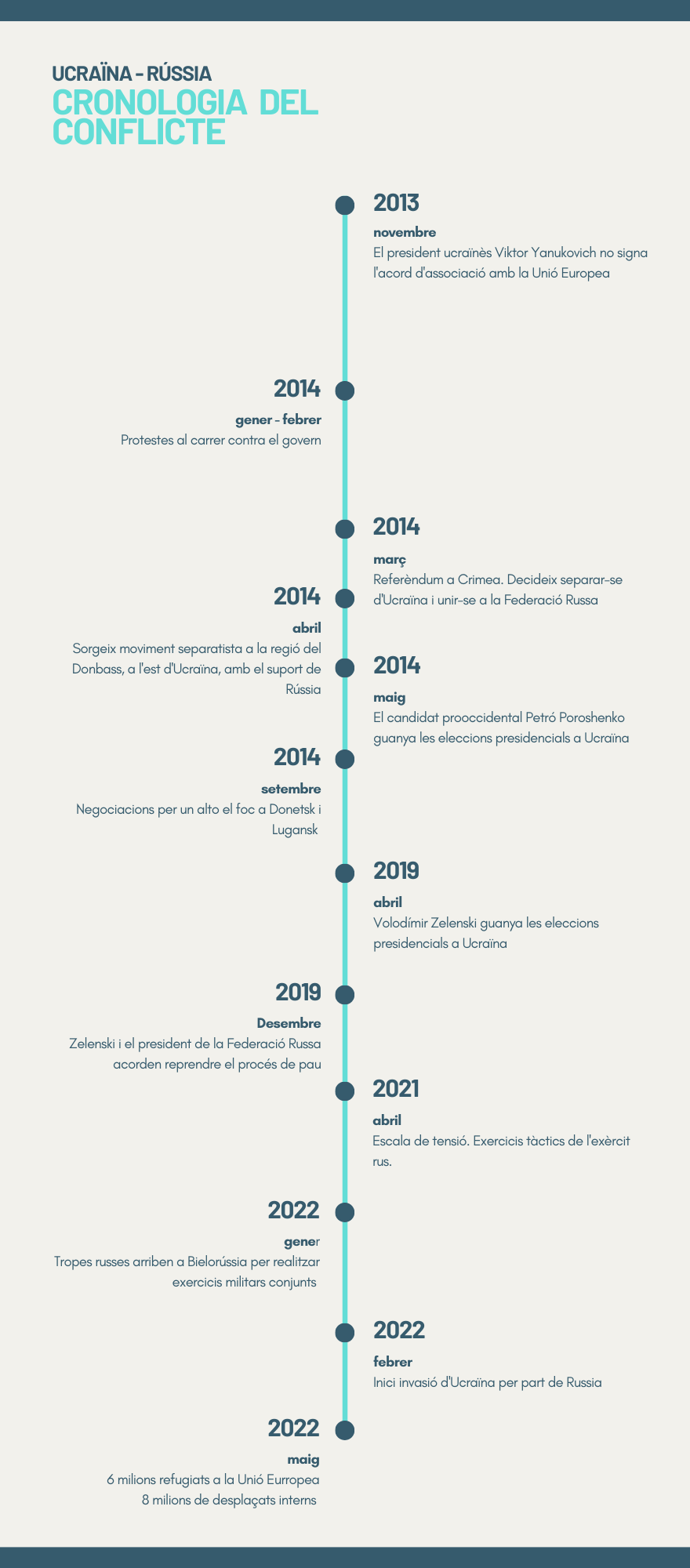 Tanmateix, hem de posar en context el conflicte. Així, hem dibuixat una línia del temps amb la cronologia dels darrers vint anys entre Ucraïna i Rússia. Comença el 2013 quan el president d’Ucraïna, Víktor Yanucovich, es va negar a signar l’acord d’associació amb la Unió Europea.